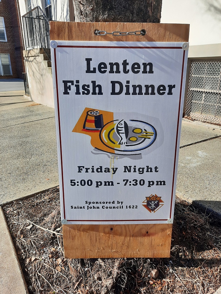 Feb 18, 2023. Lenten Friday Fish Dinner signs are posted at St. John the Evangelist Catholic Church, Frederick, MD.