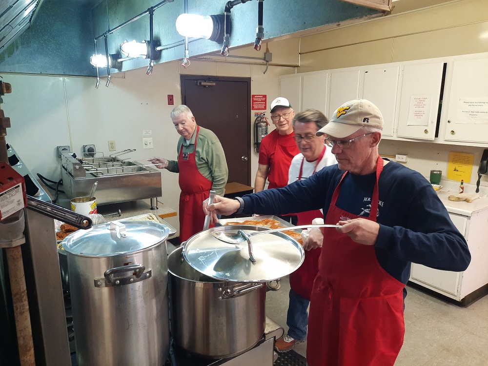 February 24, 2023. Our Friday Lenten Fish Dinner in the Sister Margaret Bauer Evangelization Center at St. John the Evangelist Church, Frederickm MD. In the kitchen, (LtoR) Br. Dave Vernot, PGK Bob Krajewski, Br. Brian Duncan, and Br. Bob McDonnell.