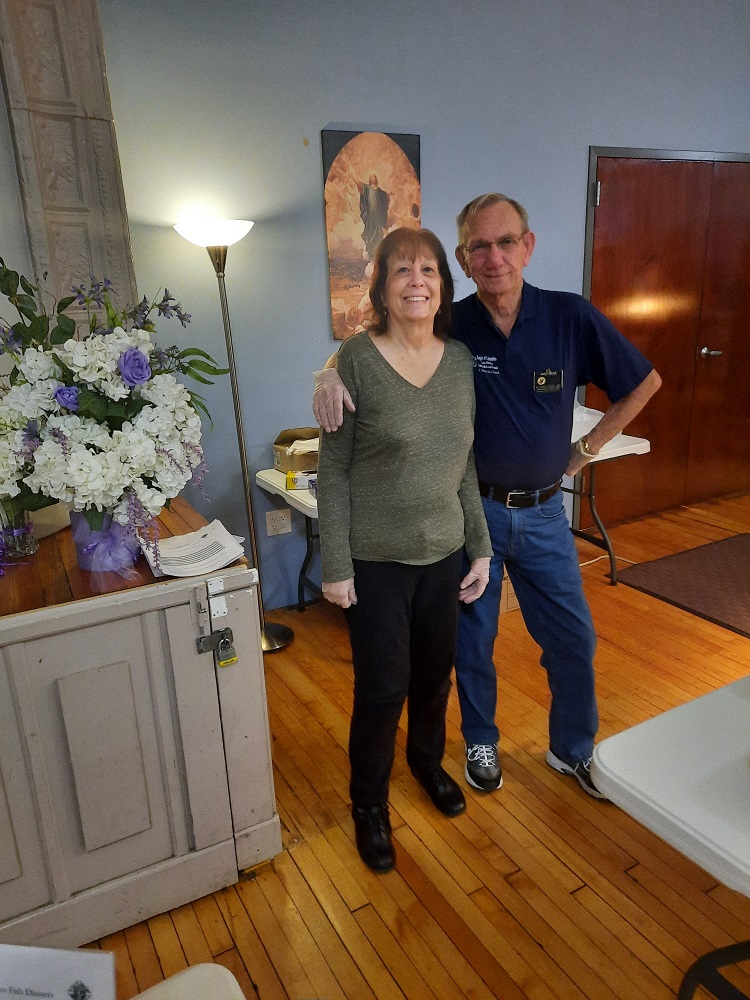Friday, March 3, 2023. Our Friday Lenten Fish Dinner in the Sister Margaret Bauer Evangelization Center at St. John the Evangelist Church, Frederick, MD. (LtoR) Kathy and Br. Pete Tokar.