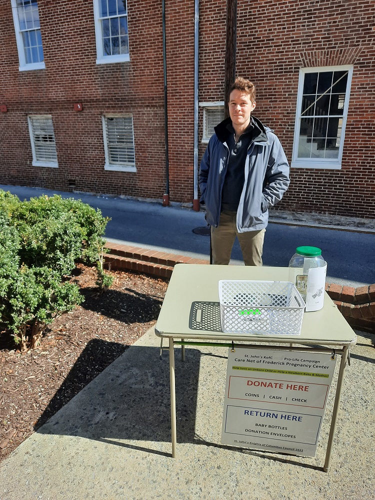 Sunday, March 5, 2023. Another day of our annual Pro-life Baby Bottle Campaign for Care Net of Frederick Pregnancy Center. We collected donations outside after Mass at St. John the Evangelist Catholic Church, Frederick, MD. Br. Peter Shuck.