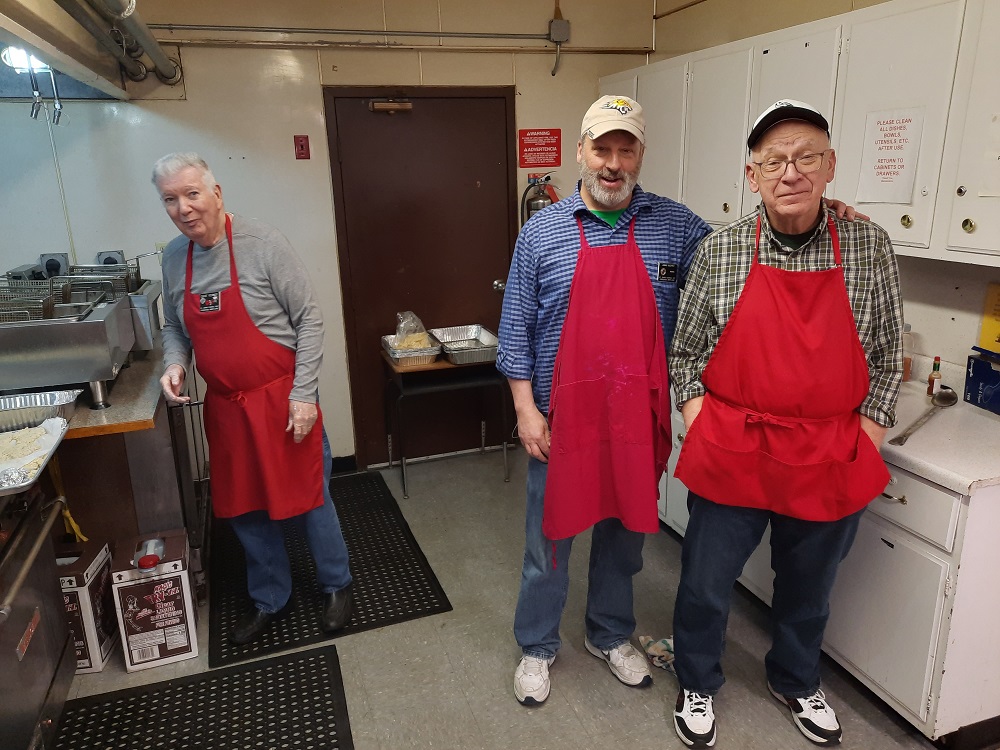 Friday, March 10, 2023. Our Friday Lenten Fish Dinner in the Sister Margaret Bauer Evangelization Center at St. John the Evangelist Church, Frederick, MD. In the kitchen, (LtoR) Br. Dave Vernot, Br. Jimbo Cooper, and PGK Bob Krajewski.
