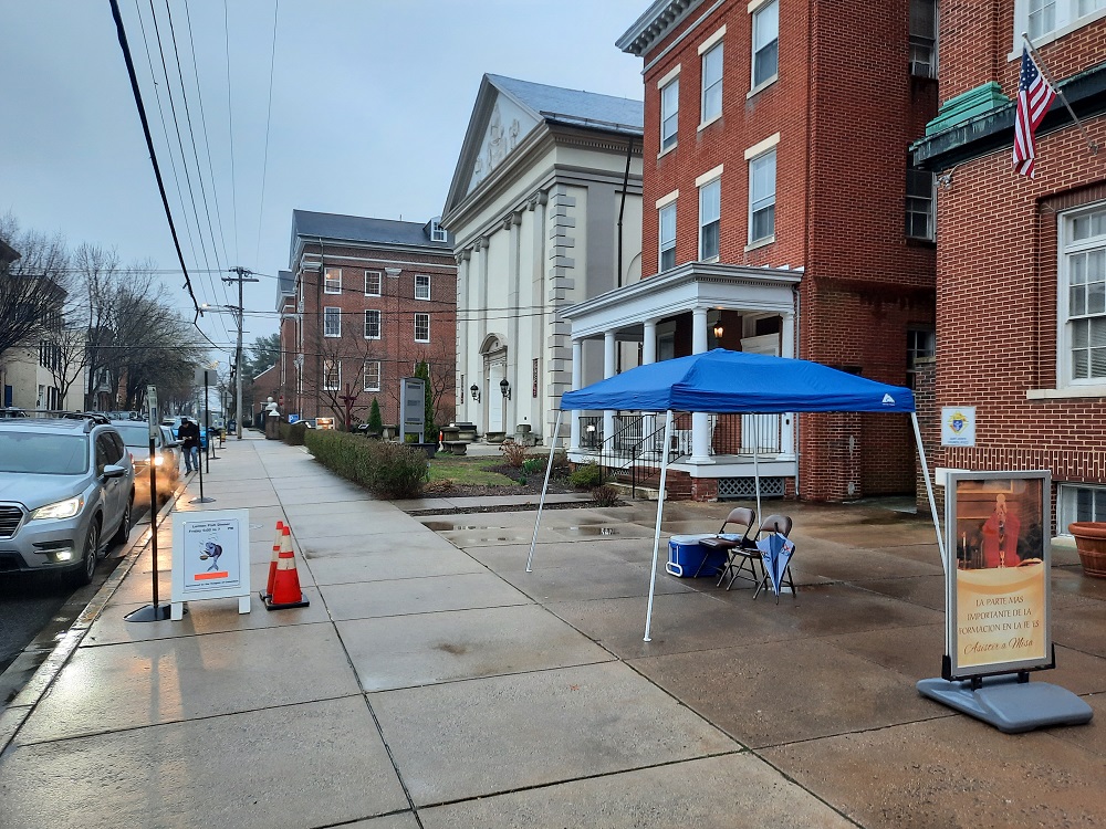 Friday, March 10, 2023. Our Friday Lenten Fish Dinner in the Sister Margaret Bauer Evangelization Center at St. John the Evangelist Church, Frederick, MD. Customers waiting at our curbside service. DGK Sean McFarland takes an order at the last car.