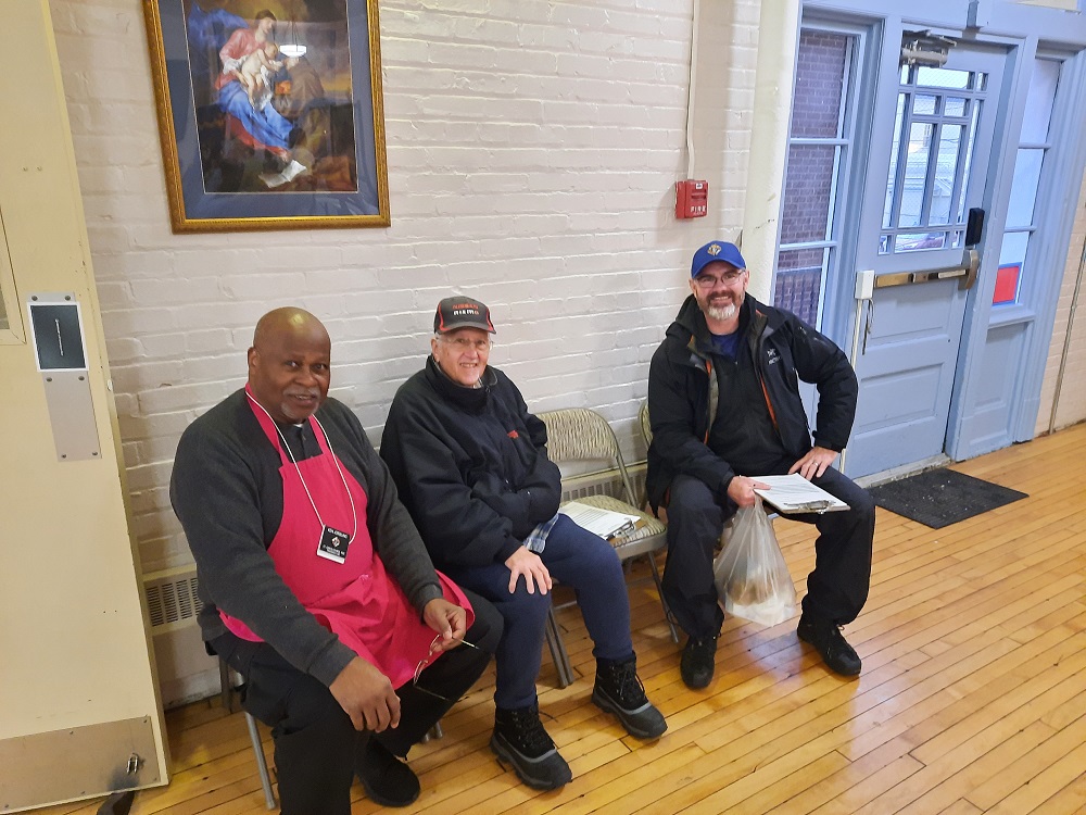 Friday, March 10, 2023. Our Friday Lenten Fish Dinner in the Sister Margaret Bauer Evangelization Center at St. John the Evangelist Church, Frederick, MD. Br. Br. Ken Jorsling, Br. Woody Johnston, and Br. Troy Kiessling.