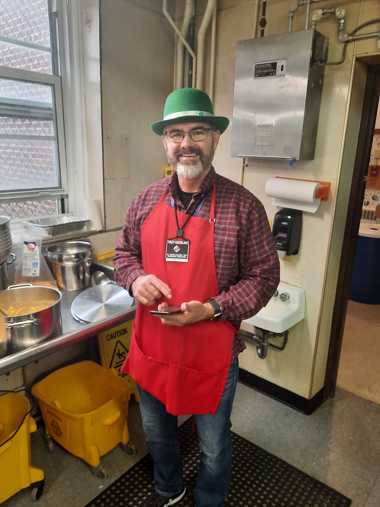 Friday, March 17, 2023. Our Friday Lenten Fish Dinner in the Sister Margaret Bauer Evangelization Center at St. John the Evangelist Church, Frederick, MD. Br. Troy Kiessling in the kitchen.