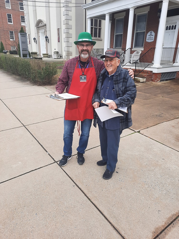 Friday, March 17, 2023. Our Friday Lenten Fish Dinner in the Sister Margaret Bauer Evangelization Center at St. John the Evangelist Church, Frederick, MD. (LtoR) Br. Troy Kiessling and Br. Woody Johnston at the curbside service.