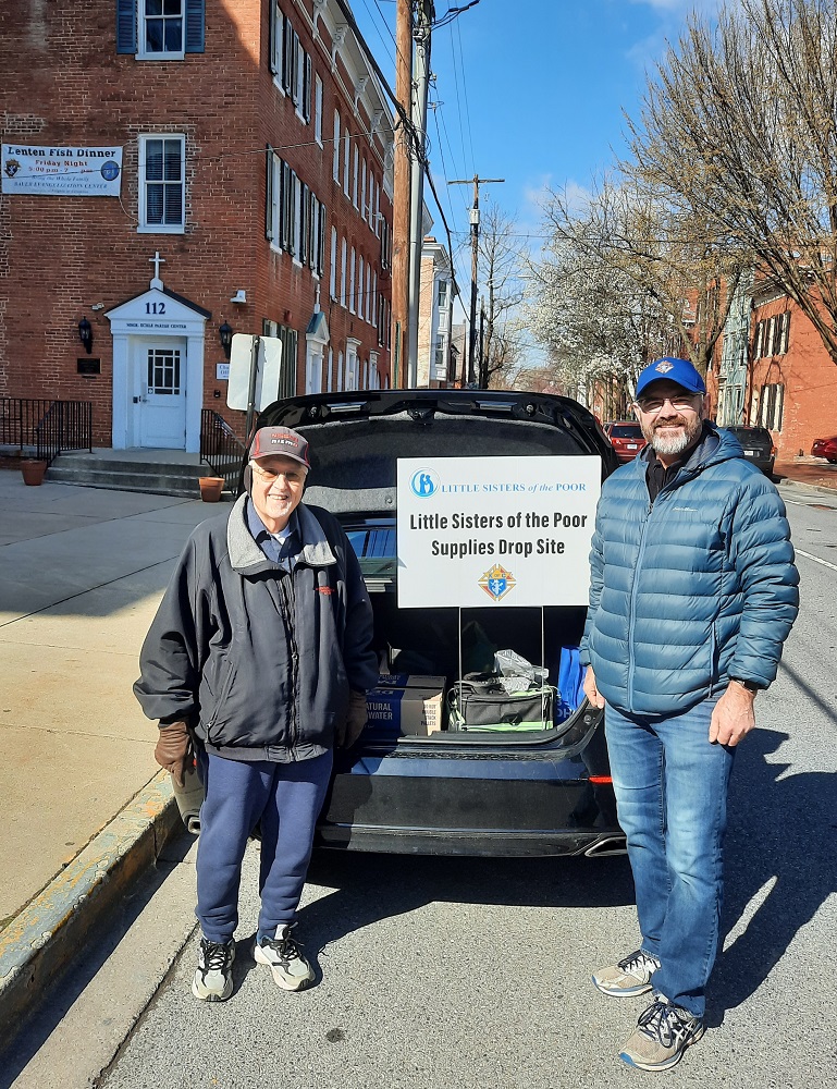 Saturday, March 18, 2023. Our monthly supply collection for the Little Sisters of the Poor of Baltimore in front of St. John the Evangelist Church, Frederick, MD. (LtoR) Br. Woody Johnston and Br. Troy Kiessling.