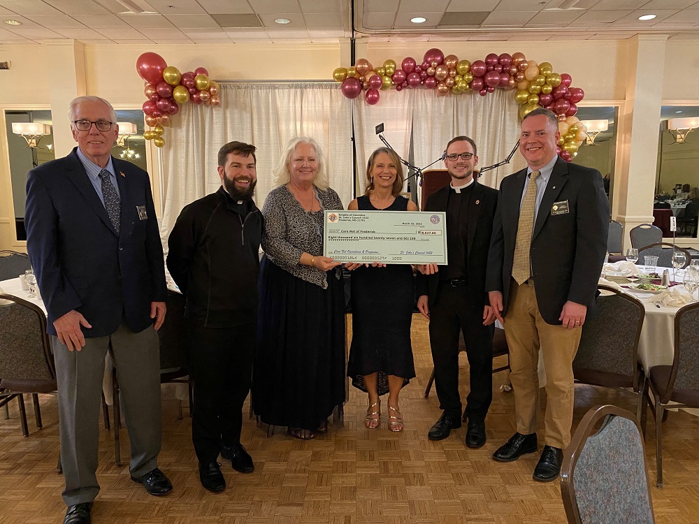 Saturday March 25, St. John’s Council 1622, Knights of Columbus, donates over $8,600 from our recent Care Net Baby Bottle Campaign at the Annual Fund Raiser for Care Net of Frederick. (LtoR) Br. Bob Boehman (St. John’s Council Life Programs Director), Rev. Matt DeFusco (St. John the Evangelist Church), Dr. Sandy Christiansen (National Medical Director for Care-Net), Linda King (Executive Director of Care Net Frederick), Deacon Luke Koski (Seminarian at Mount St. Mary’s University), and Br. Sean McFarland (St. John’s Council Deputy Grand Knight).