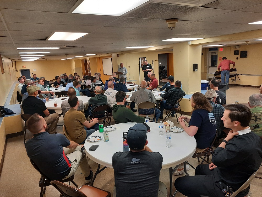 Tuesday, April 11, 2023, Knights provide dinner for Fr. Matt's monthly Men's Feast at St. John the Evangelist Church, Frederick, MD. Introductions at the beginning of the religious discussion.
