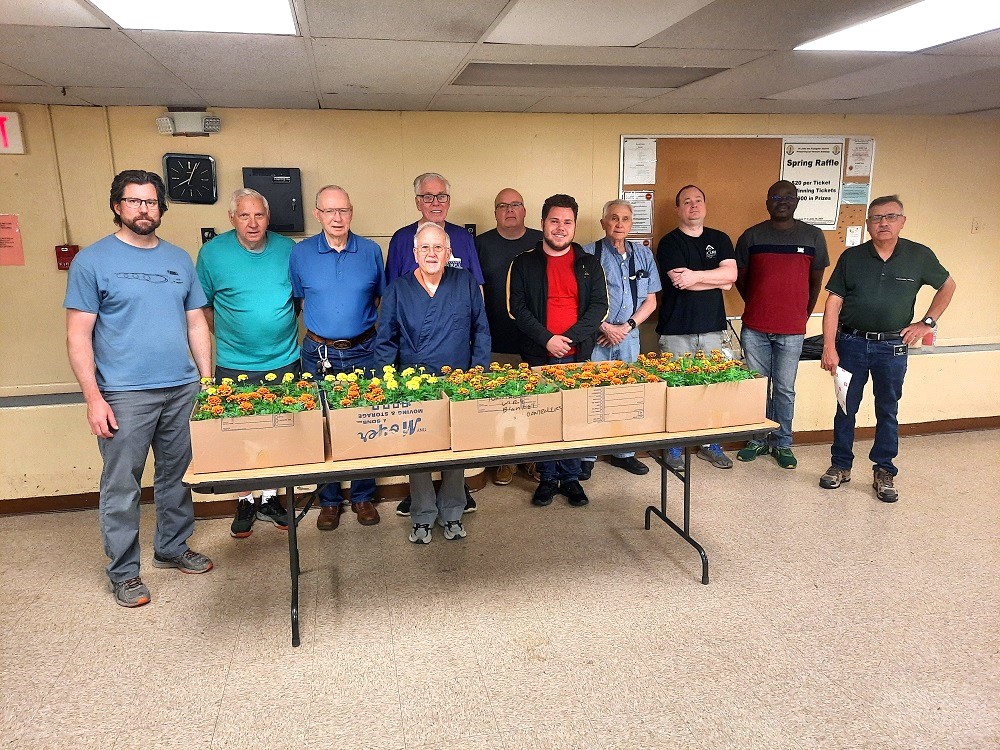 Saturday morning, May 13, 2023. Knights of St. John's Council 1622 prepare Mother's Day marigolds in the parish center cafeteria to give to mothers after Masses at St. John the Evangelist Catholic Church, Frederick, MD.