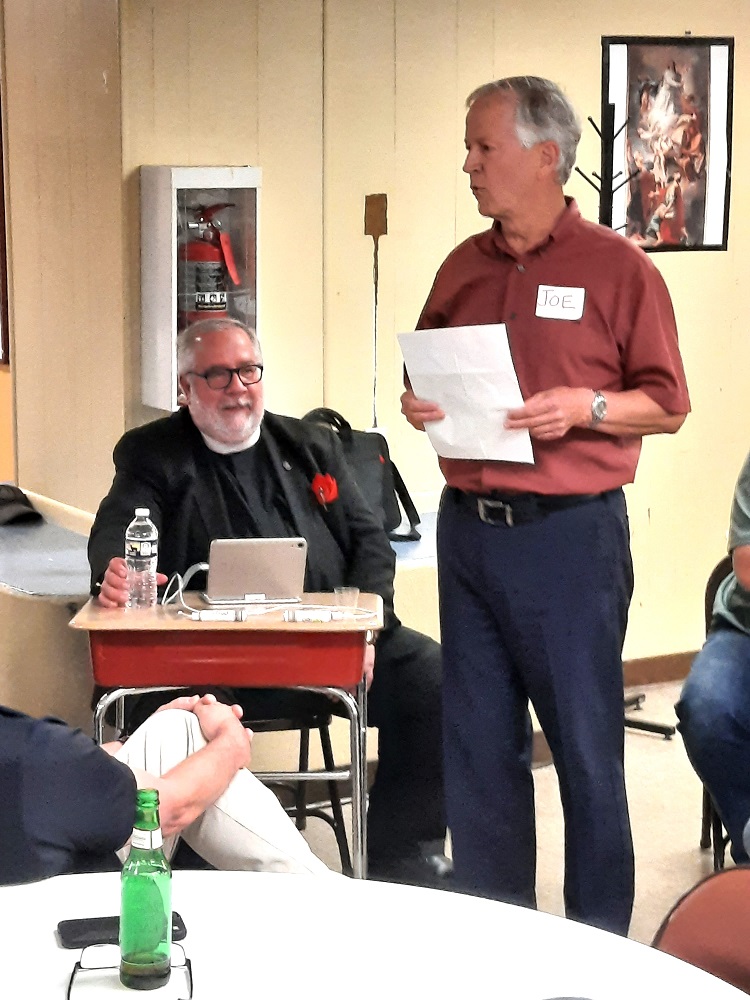 (LtoR) After the meal, parishioner Joe Craw introduces the guest speaker seated to the left, Fr. Matt to the left is Fr. Trigilio, who spoke to us about St. Joseph-patron of workers, fathers, families, and one of our parishes.
