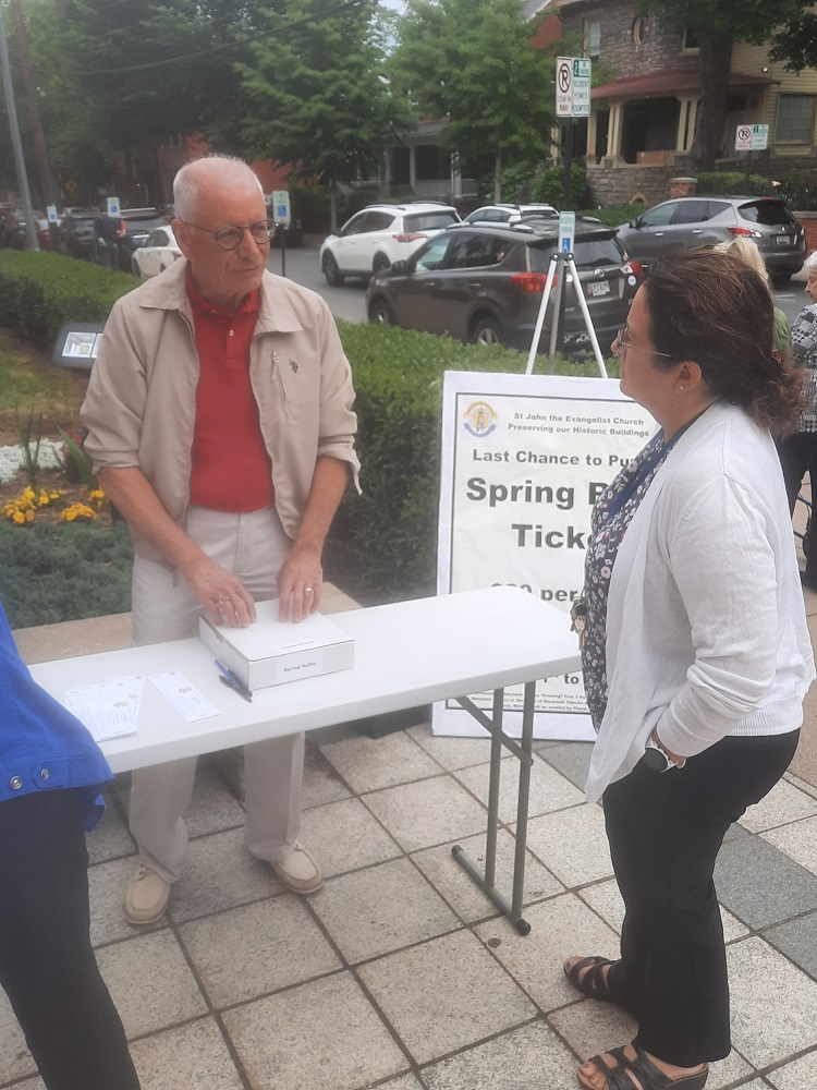 Sunday, May 28, 2023, Knights sell Spring Raffle tickets after Masses to benefit the parish Stained Glass Window Fund at St. John the Evangelist Catholic Church, Frederick, MD. (LtoR) PGK Rick Cassaza speaks with parish staff member Amy Spessard.