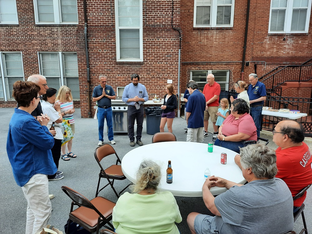Tuesday, June 6, 2023. St. John's Council has a family picnic in the rear parking lot at St. John the Evangelist Catholic Church, Frederick, MD. Grace said before eating.