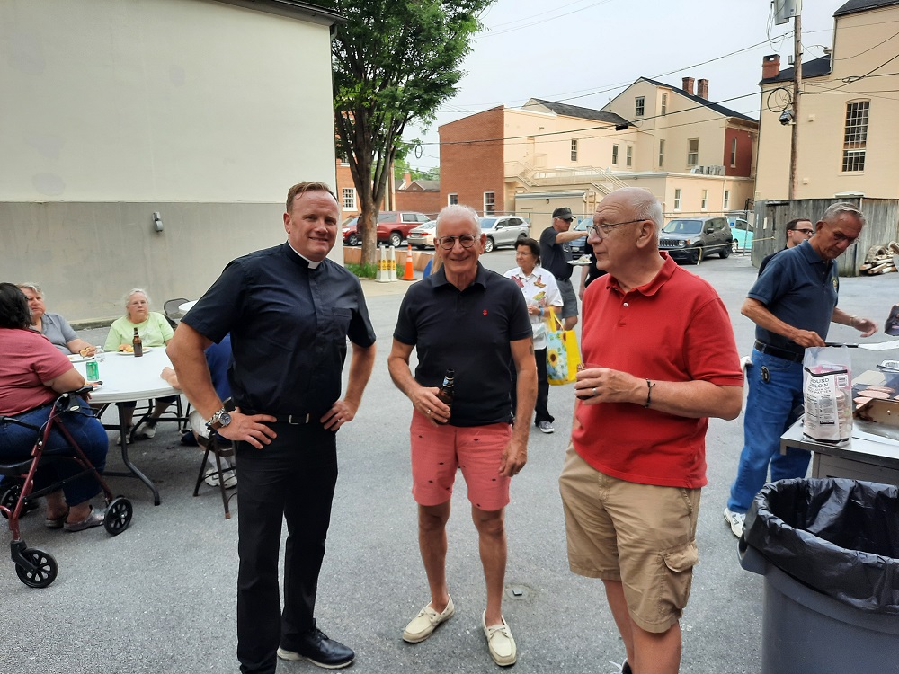 Tuesday, June 6, 2023. St. John's Council has a family picnic in the rear parking lot at St. John the Evangelist Catholic Church, Frederick, MD. (LtoR) Fr. John Williamson, PGK Rick Casazza and PGK Bob Krajewski.