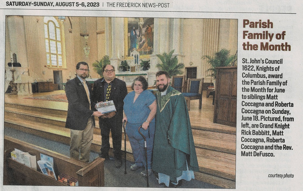Sunday, June 18, 2023. St. John's Council presents the "Parish Family of the Month Award" for June to Matt Coccagna and his sister Roberta Coccagna at the St. John the Evangelist Catholic Church, Frederick, MD.