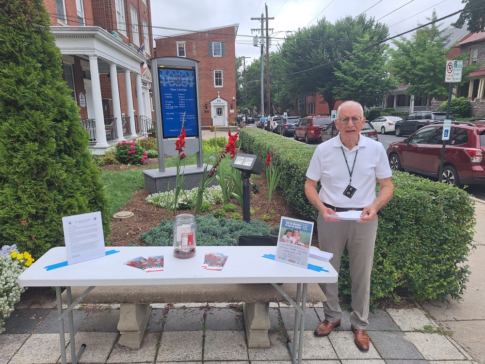 July 9, 2023. KofC St. John's Council 1622 collects donations for our annual "For the Kids Program" after Masses at St. John the Evangelist Church, Frederick, MD. This dual KofC program includes "Coats for Kids" which provides winter coatsin Western Maryland, and "Feed the Hungry" which purchases, packs and sends meals to children in Guatamala.