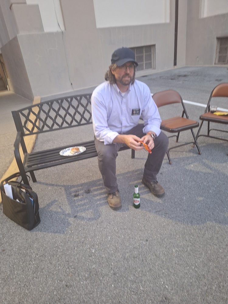 Tuesday, October 1, 2023, Knights have an impromptu cook out in the parking lot behind St. John the Evangelist Church, Frederick, MD, to enjoy the beautiful weather. Grand Knight Rick Babbitt relaxes with his meal.