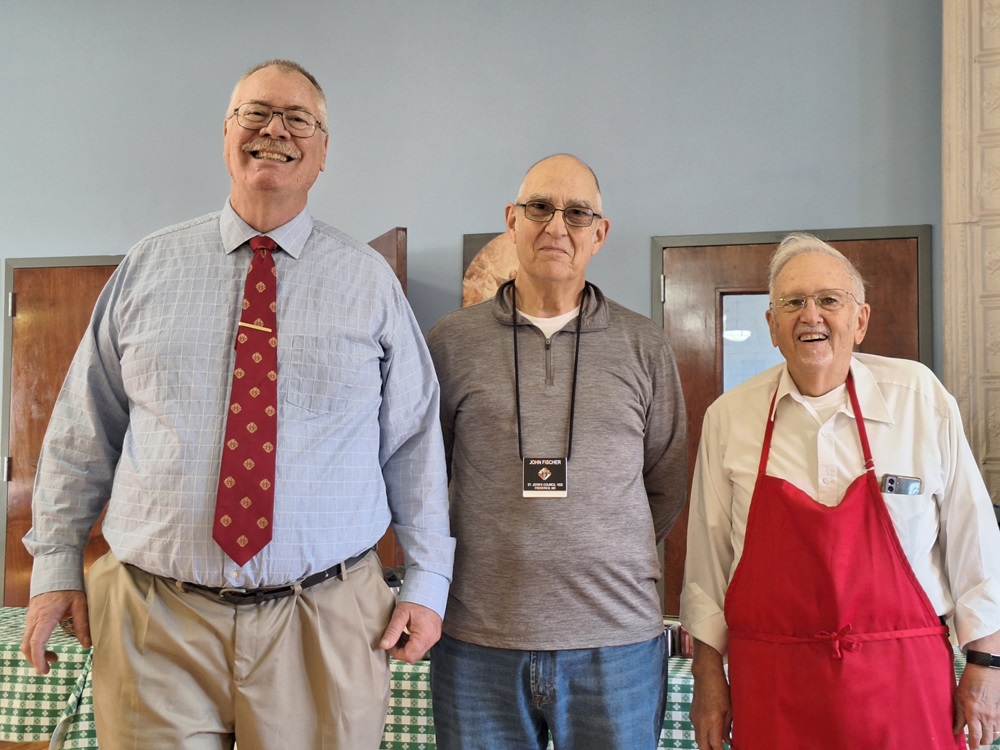 November 5, 2023, Knights serve our monthy coffee and dounut social after Masses at St. John the Evangelist Church, Frederick, MD. (LtoR) PGK Dave Satterfield, Br. JOhn Fischer, and Br. Woody Johnston.