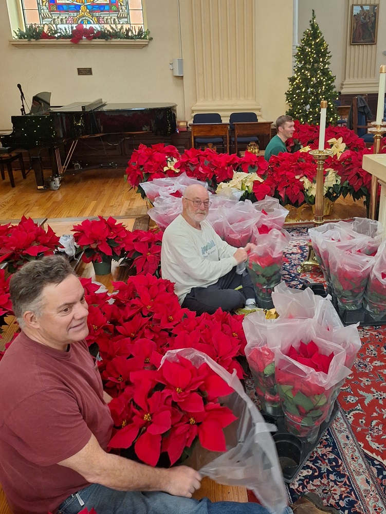 Dec 22, 2023 - Knights and family members help decorate St. John the Evangelist Church for Christmas. (LtoR) Br. Bill Bond, Br. Tom Rogers and Br. John Shearin remove poinsettias from their shipping bags.