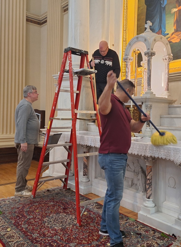 January 7, 2024 - Knights and family members help tale-down Christmas decorations at St. John the Evangelist Church. (LtoR) An unidentified parishioner, Br. Bill Sohm, and Br. Ramon Rosario.