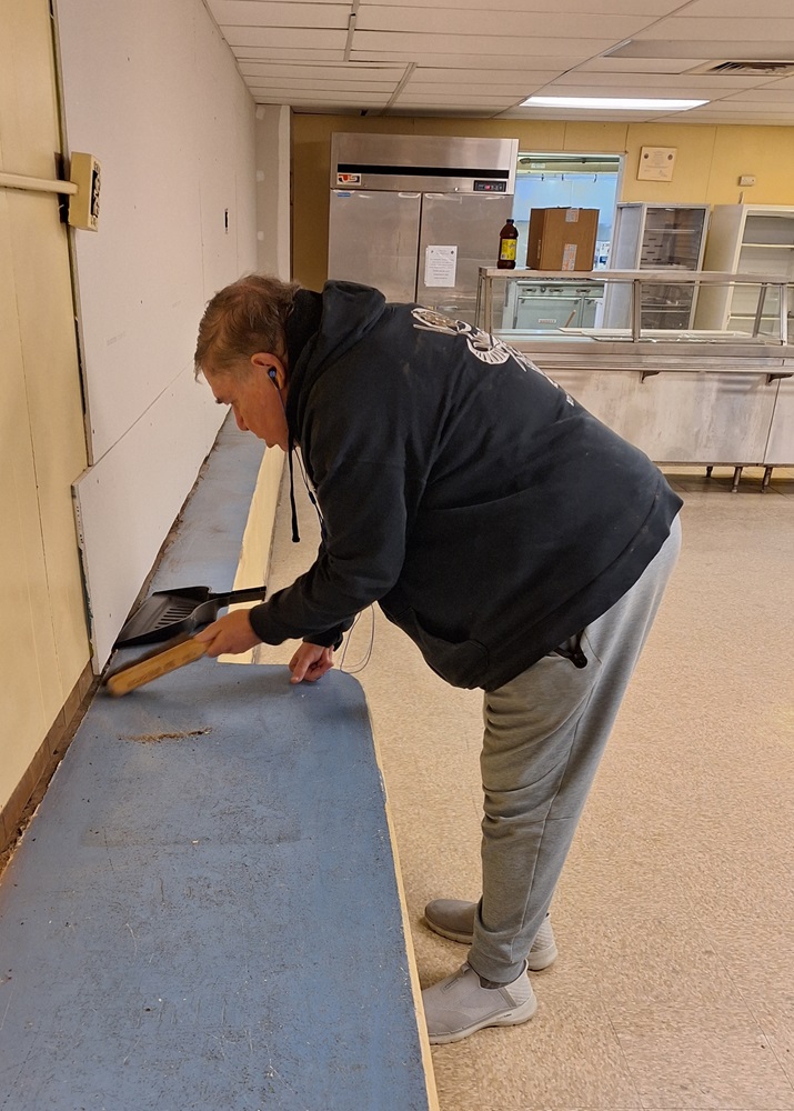 On Saturday, February 10, 2024 - Knights clean the kitchen and cafeteria in preparation of our upcoming Lenten fish dinners. Br. Mike Willett cleaning the cafeteria.