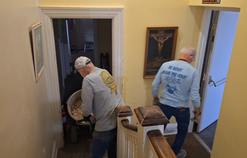 On Monday, February 12, 2024 - Knights continue demolition of rooms in the old rectory, 116 E. 2nd St. (LtoR) Br. John Fischer and PGK Rick Casazza hard at work.