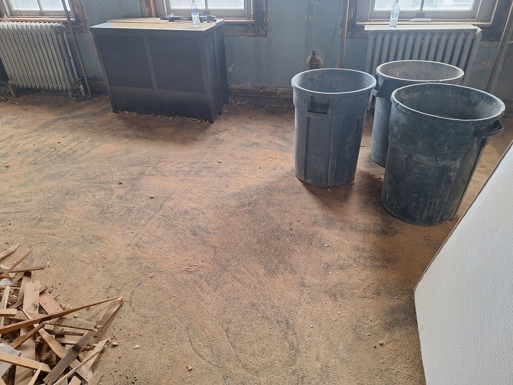 On Monday, February 12, 2024 - Knights continue demolition of rooms in the old rectory, 116 E. 2nd St. (LtoR) Front room after cleaning.