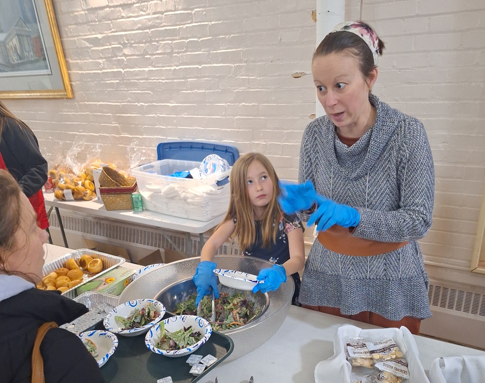 On Friday, February 16, 2024 - Knights and family members served our first Friday Lenten fish fry for 2024. Megan McQuin and her young daughter serving salads at the soup, salad and bread station.