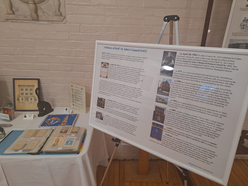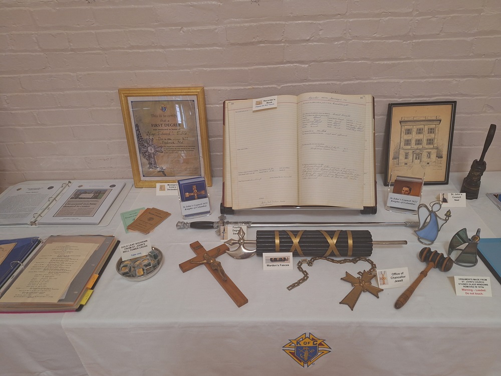 Table of historic heirlooms on display in the hall during the fish fry. Items provided for both the KofC St. John's Council No. 1622 and the St. John the Evangelist Catholic Church.