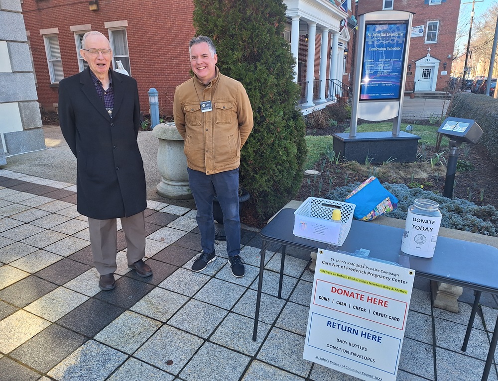 Sunday, March 3, 2024 - Knights stand outside after a Mass at St. John the Evangelist Church to collect for the last weekend of our annual "Baby Bottle Campaign". All proceeds go to the Care Net Pregnancy Center of Frederick, which supports mothers who choose life.