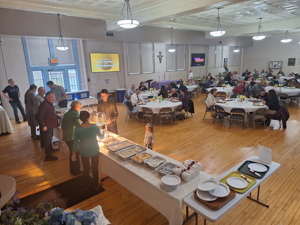 Friday, March 15, 2024 - Our Fifth KofC Lenten Fish Dinner at St. John the Evangelist Church. Another successful night with a great team. (LtoR) View of the dining room.