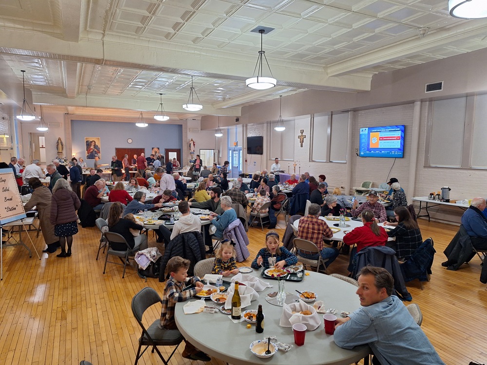 Friday, March 22, 2024, St. John's Council hosts our final Friday Lenten Fish Fry for 2024 in the Sister Margaret Bauer Evangelization Center at St. John the Evangelist Church, Frederick, MD. Customers enjoying dinner