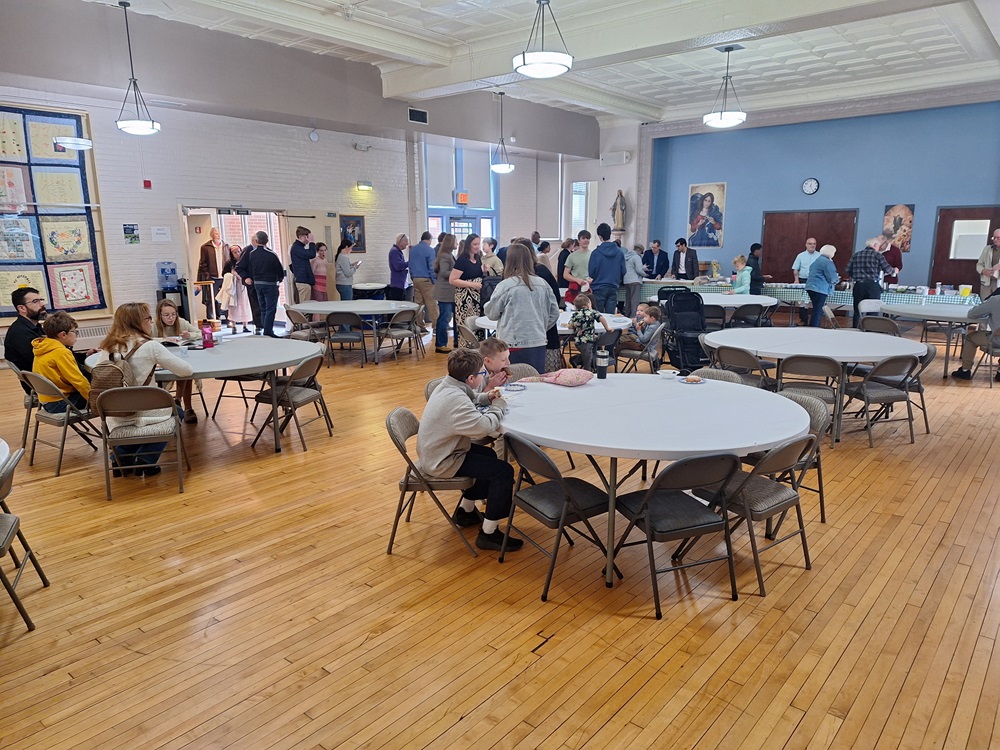Sunday, April 21, 2024. KofC St. John's Council No. 1622 hosts our last coffee and donut social for the season in the parish hall of St. John the Evangelist, Church, Frederick, MD. Photo: Starting to serve again after the next Mass.