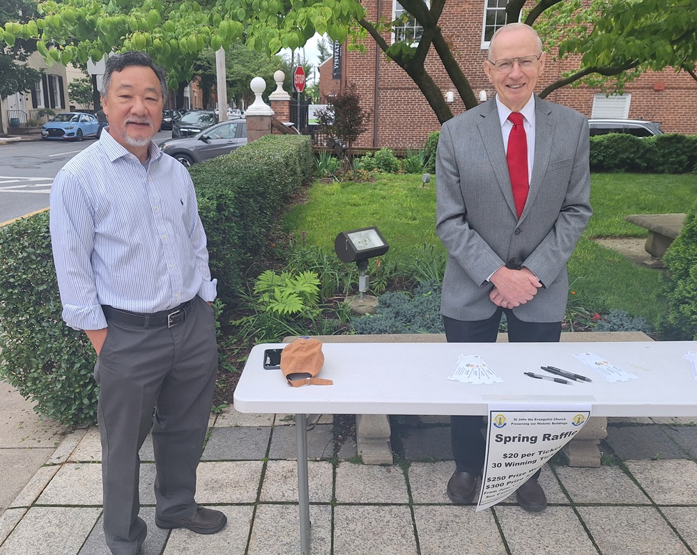 May 19, 2024 - Knights selling raffle tickets after Masses for the St. John the Evangelist Church Facility Maintenance Fund. Photo (LtoR): Br. Maurice Wong and Br. Bob Willson.
