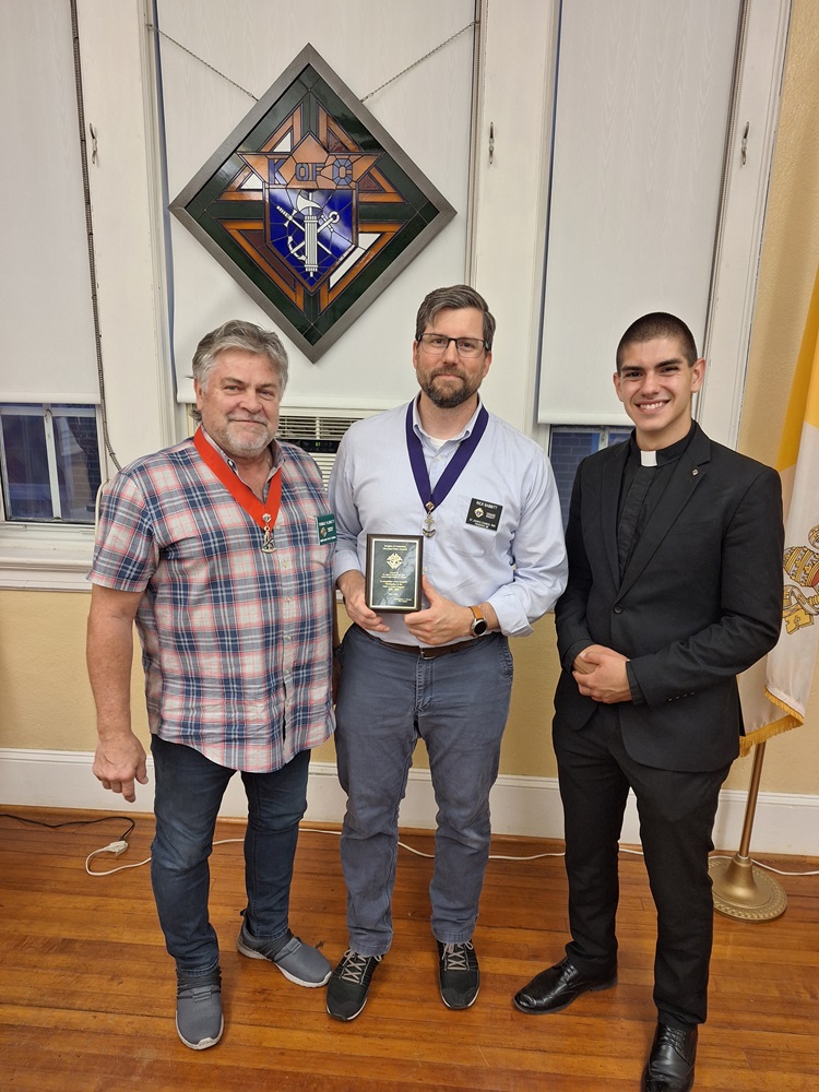 May 21, District Deputy Tom Plunkett (L) presents a Maryland State Council award to St. John's Council No. 1622 for participation in the Faith in Action Program in the 2023-2024 Fraternal Year to Grand Knight Rick Babbitt (center), observed by visiting seminarian Ryan Gerbes (R).