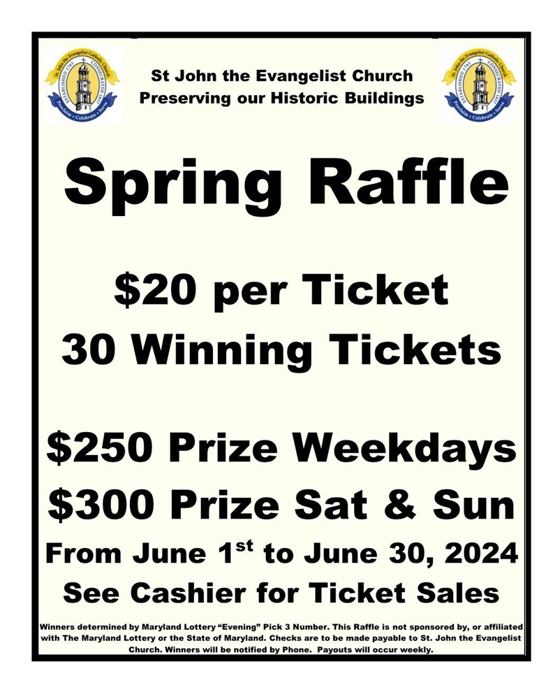 June 1, 2024 PGK Rick Casazza coordinated a 2024 Spring Raffle for the St. John the Evangelist Church Maintenance Fund, which was closed on May 31.