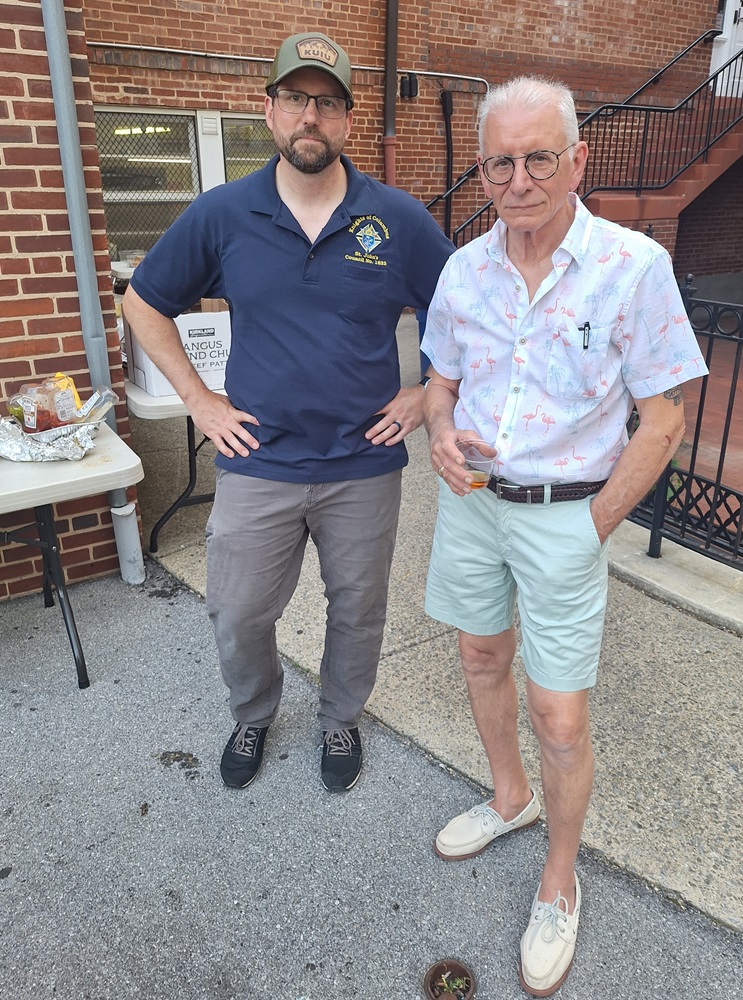 June 4, 2024. First family cook out for St. John's Council No. 1622 for the summer behind St. John the Evangelist Church. (LtoR) Grand Knight Rick Babbitt and PGK Rick Casazza.