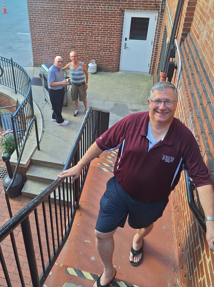 Br. John Widmann on the steps, serving as food runner from the grill to the hall. In the rear, Deacon Doug Nathan and Br. Pete Tokar stand at the grill.