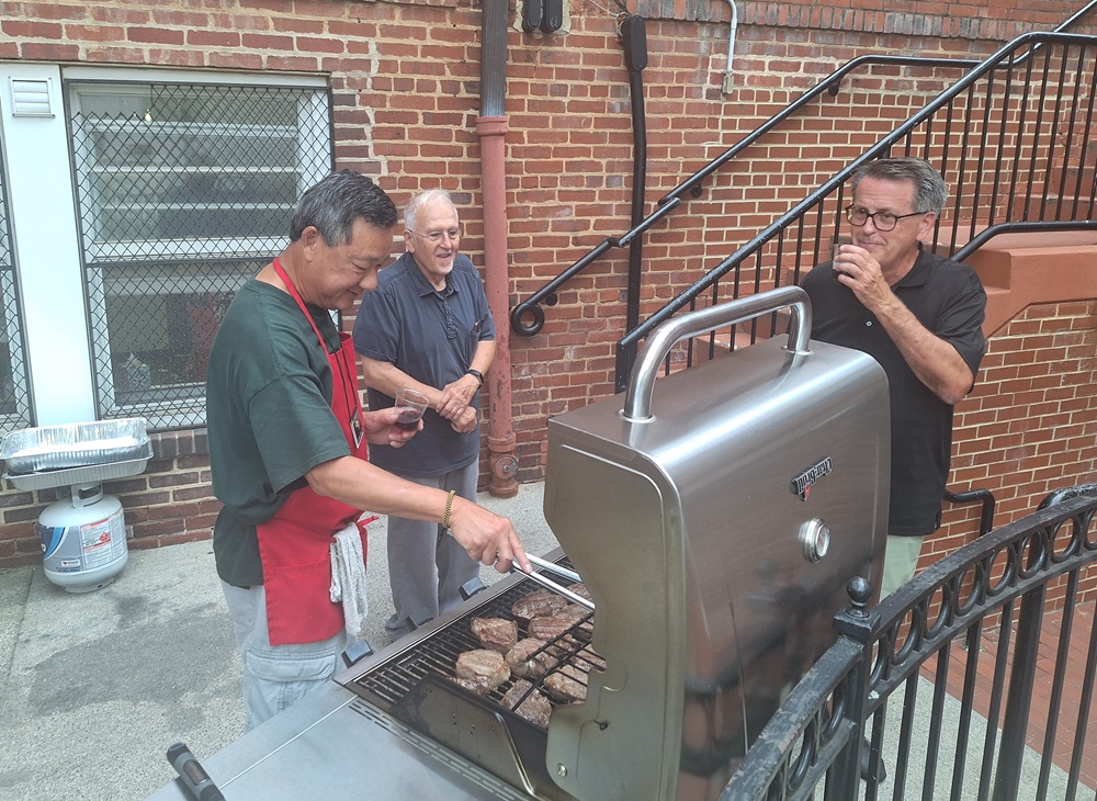 July 9, 2024. Knights prepare and serve dinner for Fr. Matt's monthly Men's Feast in the hall of St. John the Evangelist Church. (LtoR): Working at the grill, Br. Maurice Wong, Br. Woody Johnston, and Br. Brian Duncan.