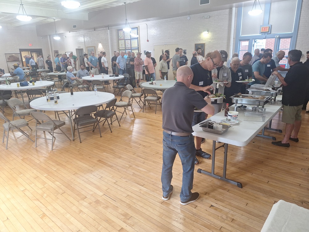 July 9, 2024. Knights prepare and serve dinner for Fr. Matt's monthly Men's Feast in the hall of St. John the Evangelist Church. Men line up for a steak dinner.