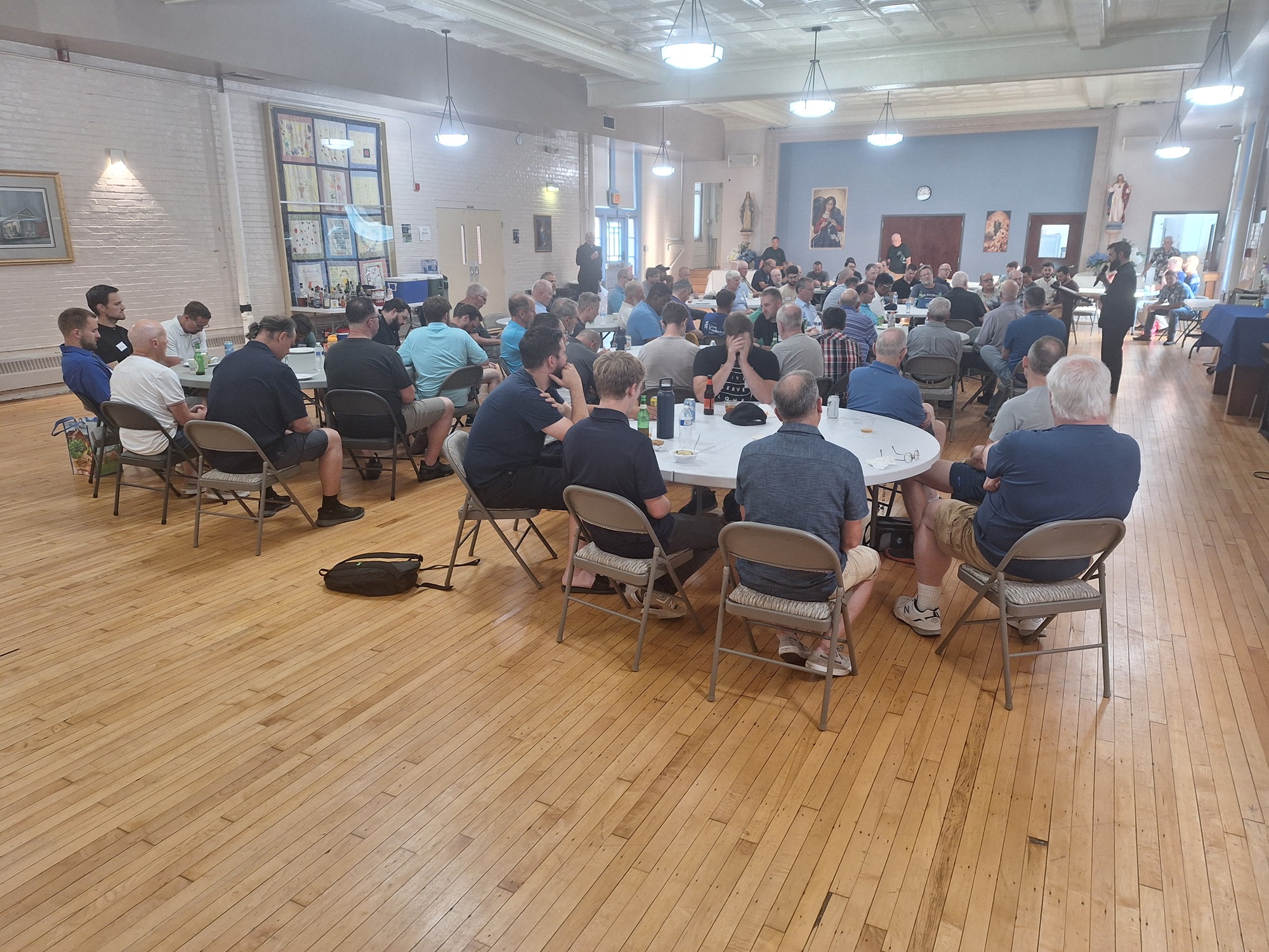 July 9, 2024. Knights prepare and serve dinner for Fr. Matt's monthly Men's Feast in the hall of St. John the Evangelist Church. Fr. Matt Defusco introduces his guest speaker, Fr. Chuck Canterna, long-time prison chaplain in Baltimore.