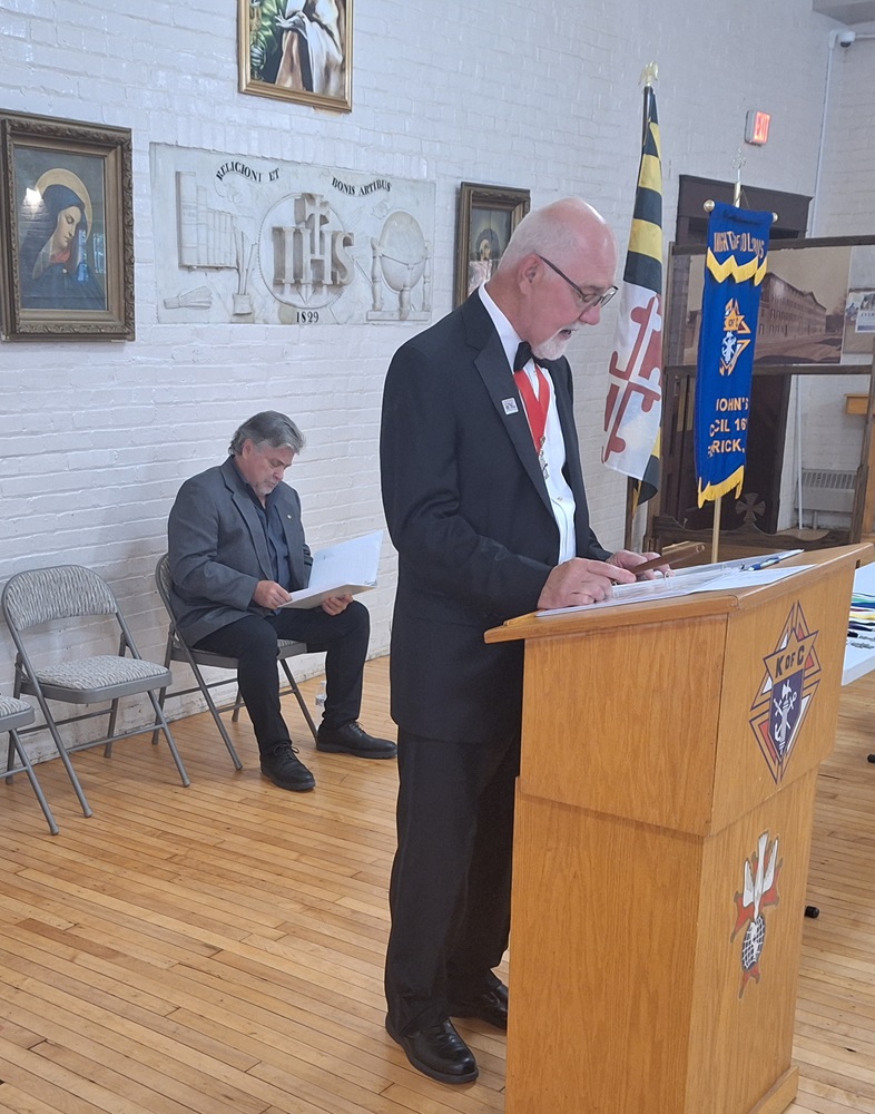 On Sunday, July 28, 2024, the Knights of Columbus, St. John's Council No. 1622 held an "Installation of Officers" ceremony for their new 2024-2025 Fraternal Year in the hall of the Sister Margaret Bauer Evangelization Center at St. John the Evangelist Catholic Church, Frederick, MD.