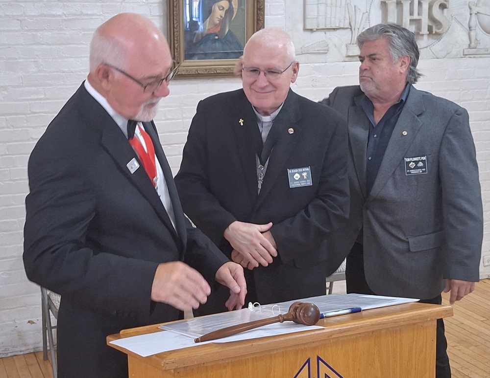 Maryland District 25 Deputy John Szarnicki (L) presents the jewel of office for Assistant to the Chaplain to Deacon Doug Nathan, observed by District Warden Tom Plunkett on the right.