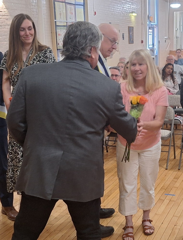 Debbie Krajewski, wife of Incoming Lecturer Robert Krajewski, receives a bouquet of flowers.