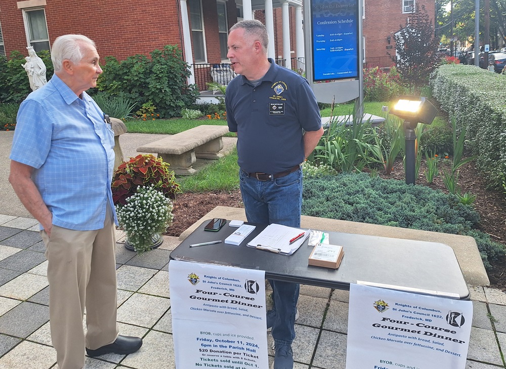 28 Sep 2024. Knights selling tickets for a Four-course Gourmet Dinner to be held on October 11. Photo (LtoR): PGK Julio Valcarcel and Grand Knight Sean McFarland.