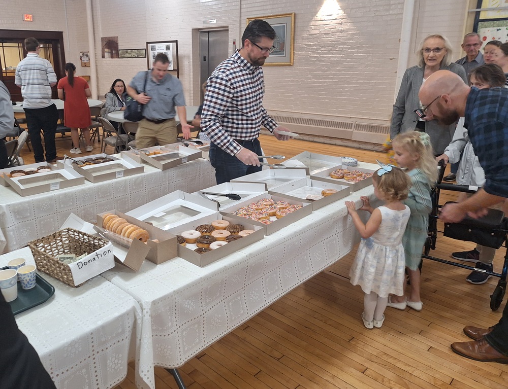 29 Sep 2024. St. John's Council 1622 hosts a monthly Coffee and Donut Social after Masses in the parish hall at St. John the Evangelist Church, Frederick, MD. Photo: PGK Rick Babbitt assists two young ladies in selecting their donuts.