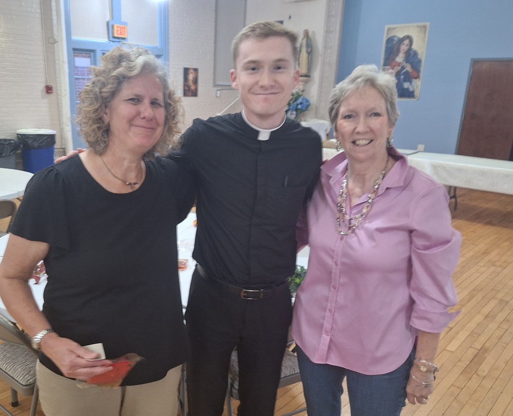 3 Oct 2024. St. John's Council 1622 prepares a meal for a Young Adult gathering in the parish hall at St. John the Evangelist Church, Frederick, MD. Photo (LtoR): Jessica McFarland, Seminarian Jack Morris, and Regina Casazza.