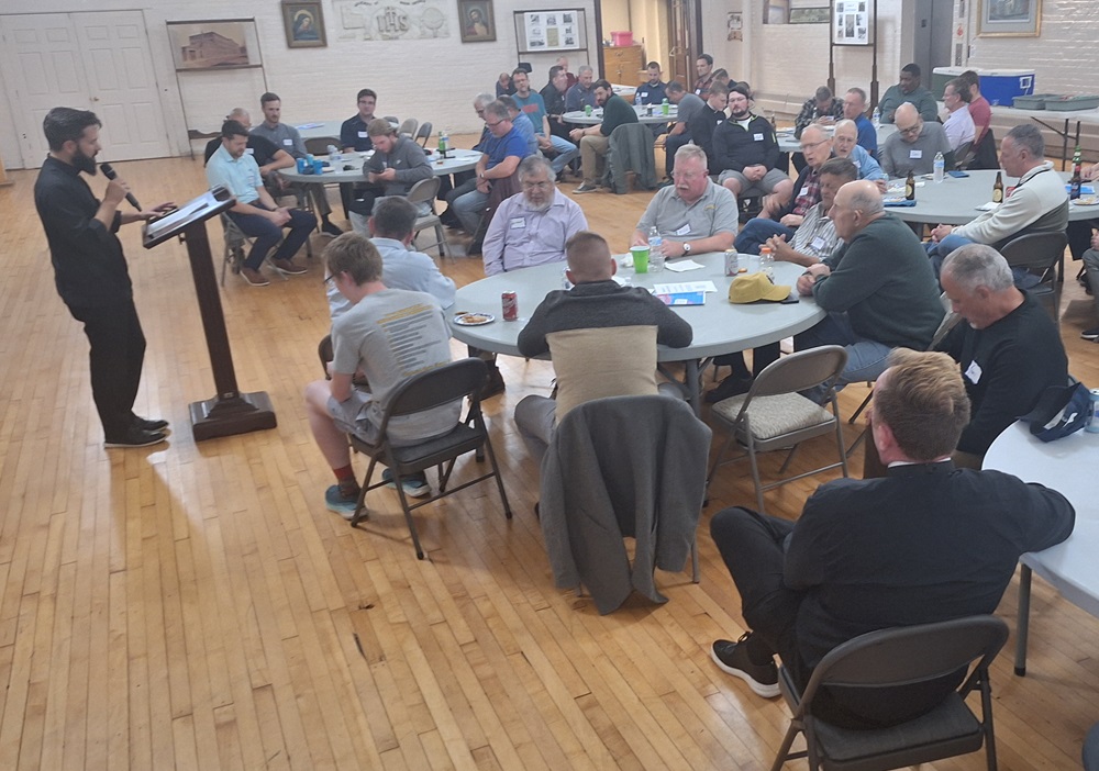 Tuesday, 8 Oct 2024. A team of Knights prepare and serve a meal to over 60 men at Fr. Matt DeFusco's monthly Men's Formation Feast in the hall of St. John the Evangelist Church, Frederick, MD.