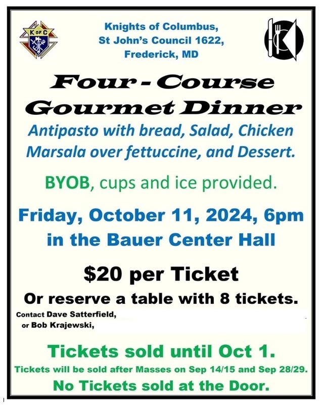 Friday, 11 Oct 2024. St. John's Council hosted a very successful KofC Gourmet Dinner fundraiser, from the lighting of the stove pilots to boxing up doggy bags and guests relaxing after dessert, in the hall of St. John the Evangelist Church, Frederick, MD. We had a great serving team. Kudos to Bob Krajewski, Maurice Wong and their kitchen team for preparing a fabulous dinner.