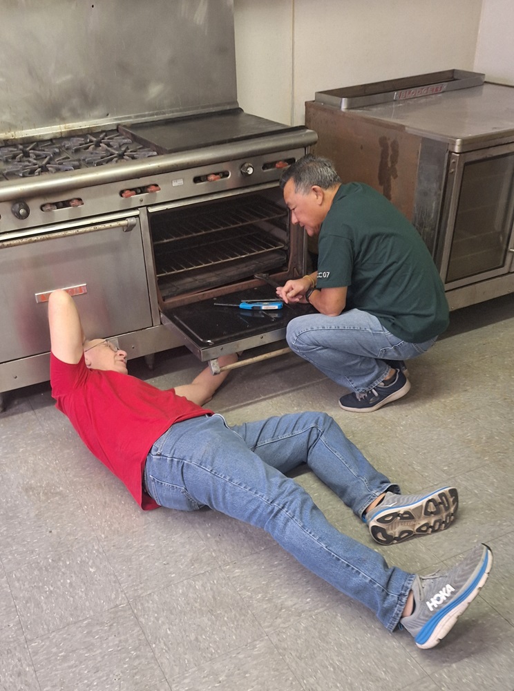 Photo (LtoR): PGK Bob Krajewski and Br. Maurice Wong light the oven pilots in the kitchen.