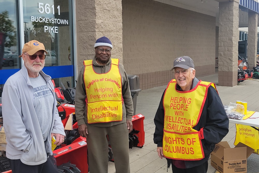 October 26, 2024, Knights collect donations in front of Lowe's Home Improvement on MD Route 85 for our annual Tootsie Roll Campaign for the Intellectually Challenged. Photo (RtoL): Br. Tom Rogers, Br. Ken Jorsling, and Br. Woody Johnston.
